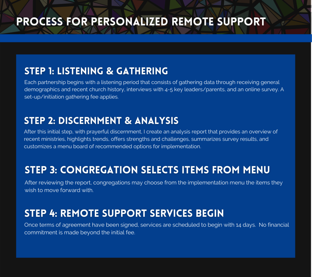 If so, personalized remote support might be a good fit for your congregation! I offer the following: