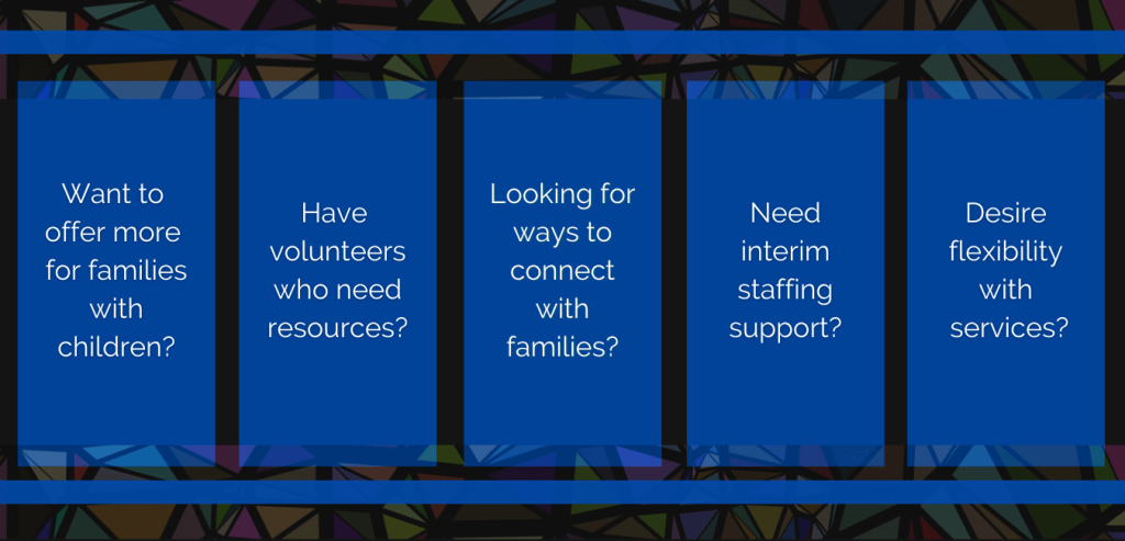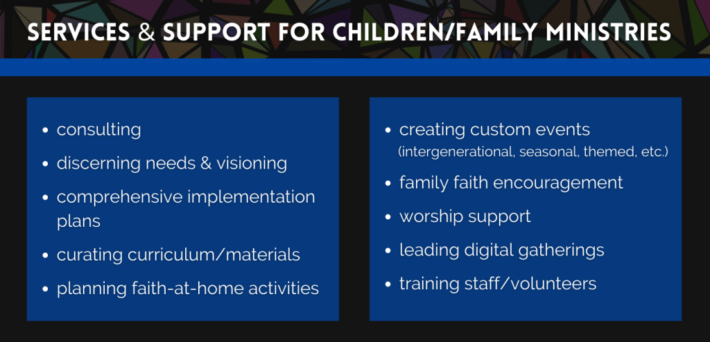 Partnering with congregations to offer resources and support to ministries with children and families. All services are customized to your specific context, needs, and gifts.